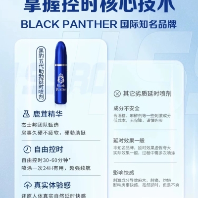 黑豹五代延遲噴劑 ,專幫助床上延長時間和硬度 还可以做为调理滋补,日常养护,具有改善助勃和延时双重效果。 最快20分钟见效 有效时间长大24小时